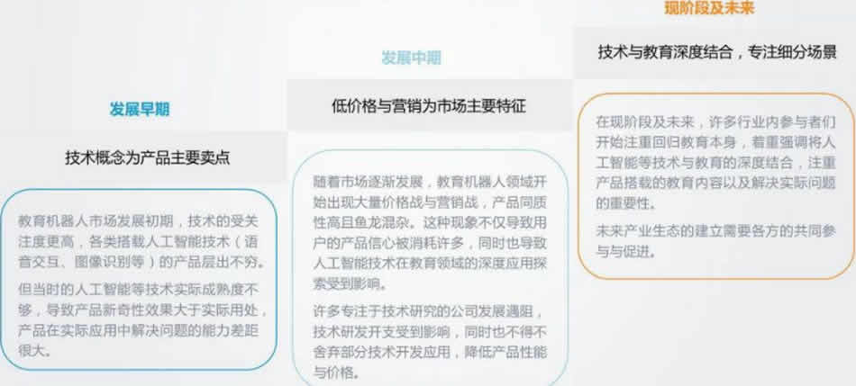 教育機(jī)器人經(jīng)歷了從概念先行到價格營銷到回歸內(nèi)容與價值本質(zhì)的發(fā)展階段變遷。