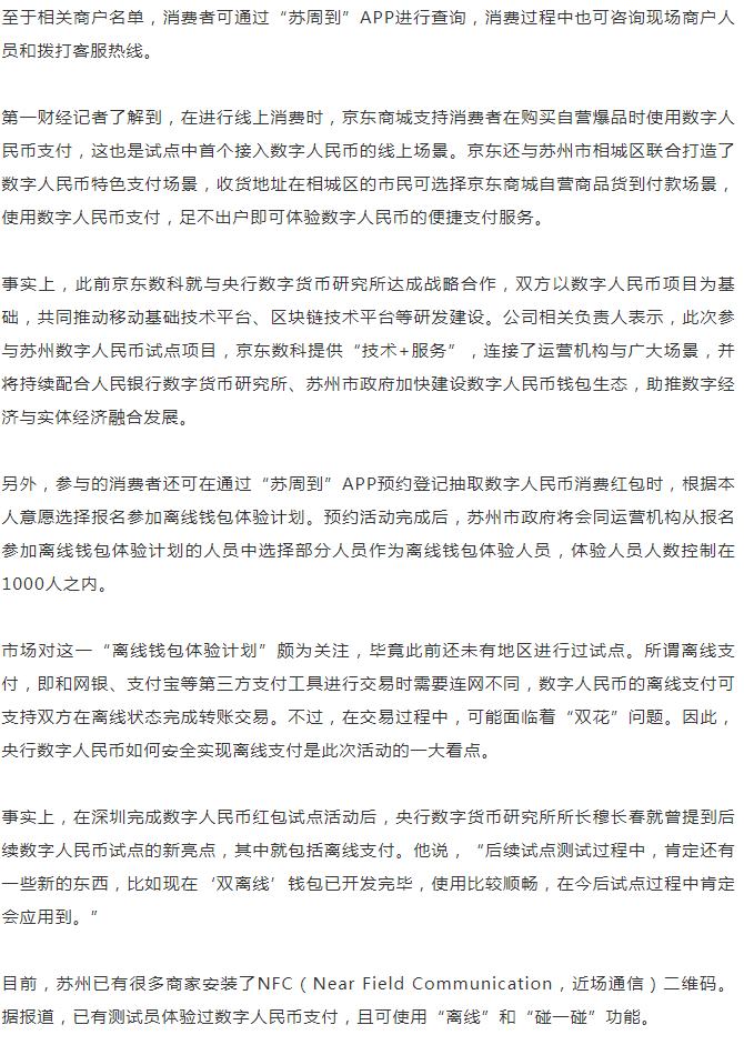 蘇州數(shù)字人民幣消費(fèi)紅包活動(dòng)的開展,也反映了我國(guó)數(shù)字人民幣的試點(diǎn)工作正穩(wěn)步推進(jìn)。而和此前深圳開展紅包試點(diǎn)不同的是,本次蘇州數(shù)字人民幣紅包活動(dòng)還支持消費(fèi)者通過京東商城進(jìn)行線上消費(fèi)。