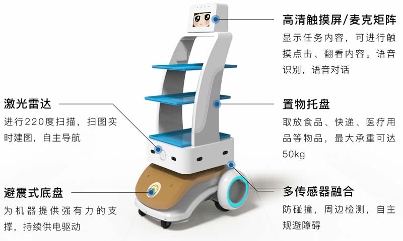 智能配送機(jī)器人是一款針對(duì)現(xiàn)代化使用環(huán)境開(kāi)發(fā)的智能機(jī)器人。具有自主行走,自主避障,防跌落,自主語(yǔ)音提示、自主充電、防跌落等功能。多載體設(shè)計(jì),適合車站、校園、醫(yī)院、物流、機(jī)場(chǎng)、酒店、商場(chǎng)等多場(chǎng)合、多用途使用,在降低人員勞動(dòng)強(qiáng)度的同時(shí),大幅度節(jié)省運(yùn)營(yíng)成本,提G工作效率,提升服務(wù)質(zhì)量,幫助實(shí)現(xiàn)工作場(chǎng)景信息化、智能化、科技化、現(xiàn)代化,提供良好的服務(wù)體驗(yàn)。