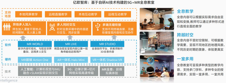 專注于混合現(xiàn)實(MR)L域的影創(chuàng)科技,以融合人工智能技術(shù)的MR混合現(xiàn)實眼鏡為核心,構(gòu)建了“5G+MR”全息教室的解決方案。該系統(tǒng)在教
