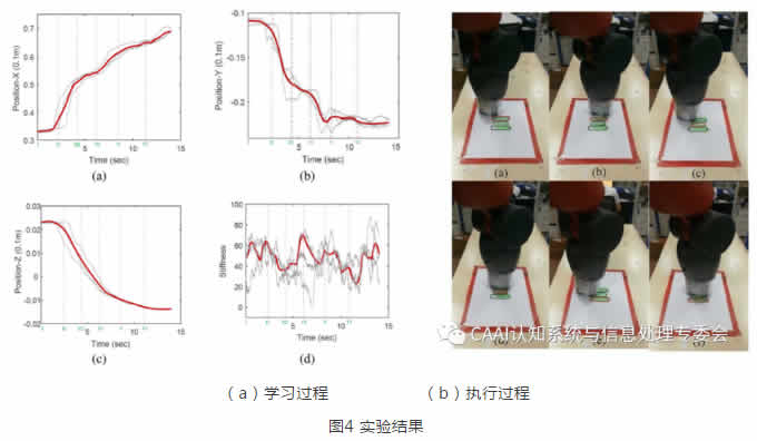 操作者通過Touch X控制Baxter機(jī)器人執(zhí)行繪圖任務(wù),整個(gè)任務(wù)過程進(jìn)行3次人機(jī)協(xié)作示教,繪圖任務(wù)在一張大小為210mm297mm (A4)的二維空間內(nèi)進(jìn)行。圖4(a)所示為繪畫任務(wù)的運(yùn)動軌跡和剛度軌跡;疑為人機(jī)協(xié)作繪畫的軌跡,紅色曲線為任務(wù)生成階段的結(jié)果。生成階段可以劃分為6個(gè)步驟(I-VI)和三個(gè)子任務(wù)。在步驟I和II中,Baxter機(jī)器人開始繪圖子任務(wù)1。步驟II和步驟III,Baxter機(jī)器人右臂末端離開紙張進(jìn)行下一次繪圖操作。類似地,子任務(wù)2和子任務(wù)3分別由步驟III到IV和步驟V到VI完成。在任務(wù)學(xué)習(xí)階段,操作者的手臂剛度是隨著繪畫任務(wù)過程的變化而變化。如圖4(b)所示,Baxter機(jī)器人采用生成的剛度執(zhí)行繪畫任務(wù)。從圖4(b)中的(a)-(f)可以得出,Baxter機(jī)器人利用生成的模型成功的完成了繪圖任務(wù)。