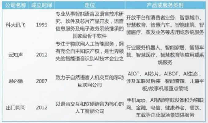 前國內(nèi)的頭部技術供應商主要包括科大訊飛、云知聲、思必馳、出門問問等。它們均擁有自主核心科技,專注智能語音技術及輸出語音識別等應用。其中科大訊飛的語音識別技術能力強,市場占有率G。目前行業(yè)整體語音識別成功率已達較G水平,但在 具體落地時仍然會存在諸如語音交互效果受周圍環(huán)境影響較大、溝通方式不夠人性化等問題,因此仍需在場景應用層面繼續(xù)改善。