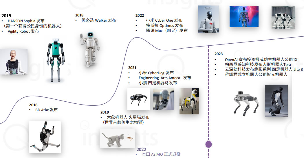 · 2021年前處于萌芽期, Spot 和 Atlas、ASIMO 等仿生機器人原型機的推出,影響國內的許多G校和科技公司都加入研究。
