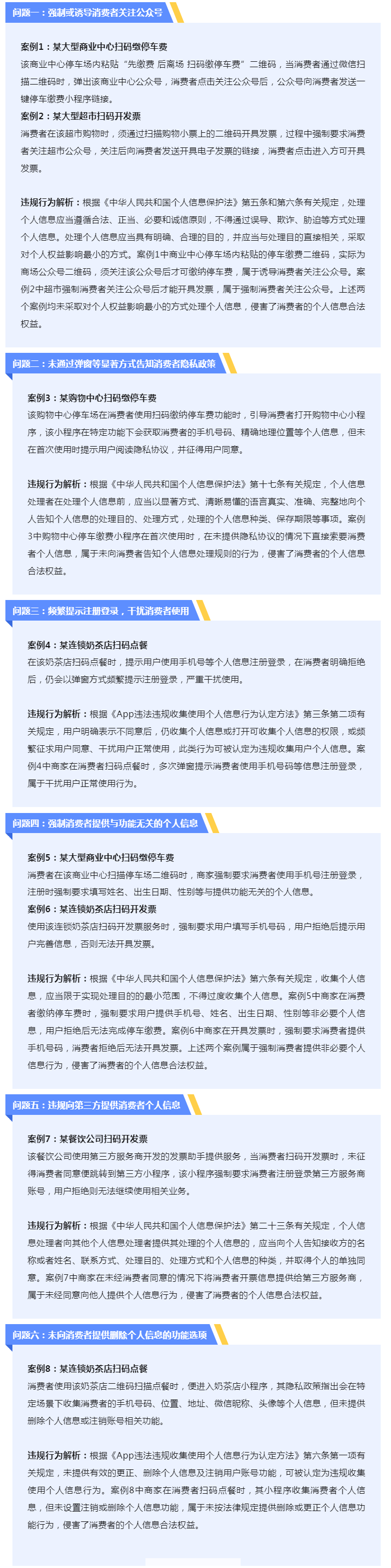 為進一步規(guī)范我市掃碼消費服務(wù)經(jīng)營行為,切實保護消費者個人信息合法權(quán)益,綜合對我市提供掃碼消費服務(wù)二維碼抽樣測試情況,對六類常見易發(fā)違規(guī)問題進行案例解析,根據(jù)《中華人民共和國個人信息保護法》《App違法違規(guī)收集使用個人信息行為認定方法》等法律法規(guī),提出六條合規(guī)指引,供全市提供掃碼消費服務(wù)的經(jīng)營者遵照執(zhí)行。
