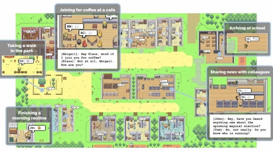 論文還展示了如何將這些生成代理實(shí)例化,用于填充一個(gè)類似于《模擬城市》的互動(dòng)沙箱環(huán)境,該環(huán)境可與二十五個(gè)生成代理進(jìn)行自然語言交互。在評(píng)估中,這些生成代理產(chǎn)生了可信的個(gè)體和群體行為,例如從一個(gè)用戶指定的觀念開始,即一個(gè)代理想舉辦情人節(jié)派對(duì),代理們?cè)诮酉聛淼膬商靸?nèi)自主傳播派對(duì)的邀請(qǐng),結(jié)交新朋友,互相邀請(qǐng)參加派對(duì),并協(xié)調(diào)在正確的時(shí)間一起參加派對(duì)。