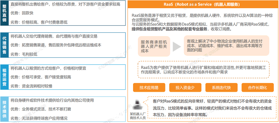 目前服務(wù)機器人廠商商業(yè)模式主要為五類:直銷、分銷、租賃、技術(shù)授權(quán)、RaaS