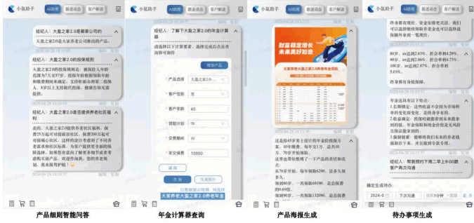 保險(xiǎn)AI大模型助手在保險(xiǎn)代理人與客戶溝通中的廣泛應(yīng)用,提供實(shí)時(shí)問答支持和資料查詢功能,簡化了代理人查詢產(chǎn)品資料的流程,減少了溝通次數(shù),提升了客戶服務(wù)效率和質(zhì)量,增強(qiáng)了客戶體驗(yàn)和滿意度。這些創(chuàng)新技術(shù)和功能的實(shí)施,顯著提升了代理人的工作效率和專業(yè)能力,有效支持了保險(xiǎn)企業(yè)在競爭激烈的市場中保持競爭優(yōu)勢。
