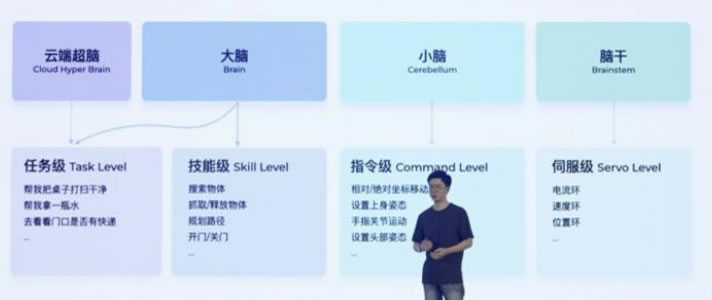 “小腦”負責(zé)產(chǎn)生運動控制指令生成,比如設(shè)置上身姿態(tài)、控制指關(guān)節(jié)運動、控制頭部姿勢等,涉及運動學(xué)、動力學(xué);另外“腦干”這一層級主要是解決底層的運動控制能力問題,比如所有電
