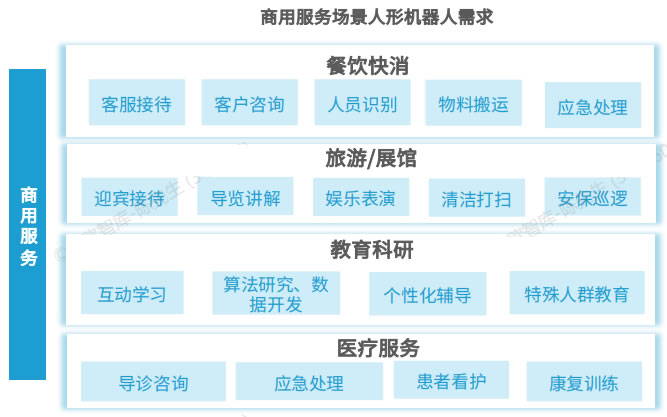 人形機器人的互動能力使其在商用服務(wù)中具有較好的應(yīng)用前景,  人形機器人可以支持現(xiàn)實空間中的學(xué)習(xí),用面部表情、肢體語言、聲音和    語音與人類交流,使互動更具吸引力,也可以通過編程來促進機器人與人類的互動 ,   目前展覽講解及科研場景已經(jīng)落地。家用場景以非標準化場     景為主,人形機器人技術(shù)很難應(yīng)對G隨機性和復(fù)雜性的家用任務(wù),目前普遍方案只是在局部小范圍的可控條件下實現(xiàn)少量復(fù)雜任務(wù),還尚需技術(shù)   持續(xù)發(fā)展。
