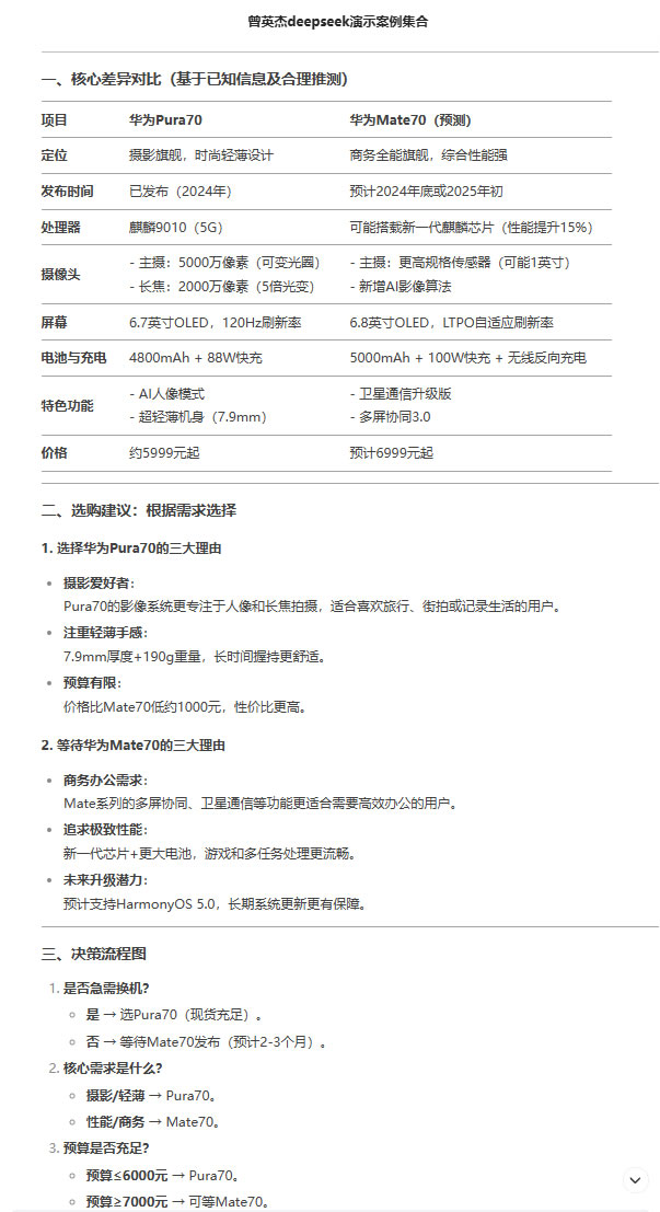 由于Mate70尚未發(fā)布,很多信息需要推測(cè), 因此 在 比較時(shí)需要指出這些不確定性,并建議用戶如果時(shí)間允許,可 以等 待Mate70發(fā)布后再做決定。