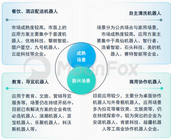 商用機(jī)器人應(yīng)用場景繁多,需求分散。目前成熟的應(yīng)用場景主要為商業(yè)配送、清洗場景,所需的功能集中于準(zhǔn)確導(dǎo)航、路線規(guī)劃、人機(jī)交互等。正在發(fā)展的場景如教育應(yīng)用、商業(yè)協(xié)作等場景注重于更有啟發(fā)性的交互引導(dǎo)和更準(zhǔn)確的機(jī)械操作。商業(yè)服務(wù)L域憑借其廣泛的受眾、活躍的市場以及對創(chuàng)新的G度接納性,能使