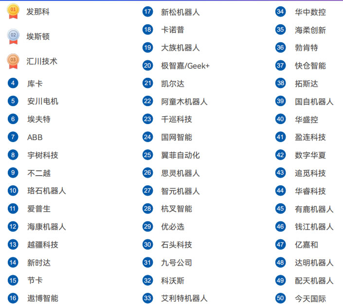 匯川技術,珞石機器人,越疆科技,節(jié)卡,埃斯頓,遨博智能,埃夫特,?禉C器人,新時達,大族機器人,阿童木機器人,新松機器人,極智嘉/Geek+
