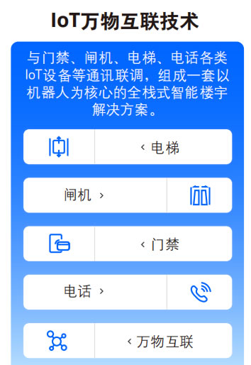 AIoT技術的核心在于通過物聯網技術支持服務機器人與各類設備(如電梯、 門禁系統、 電話系統等)建立實時連接 ,從而使機器人從孤立 的操作單元轉變?yōu)槎嗝婊ヂ摰闹悄苌鷳B(tài)中的一 環(huán)。例如 ,在智能樓宇中 ,服務機器人可以通 過IoT技術與電梯系統聯動,實現自主乘梯,為 用戶帶來全棧式的智能服務體驗。