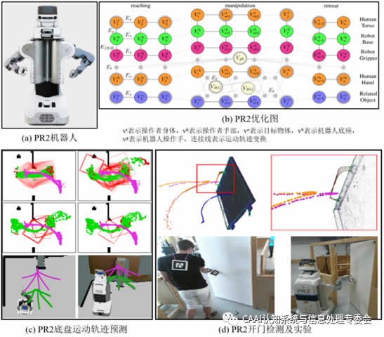 Personal Robot 2(PR2)[5]是Willow Garage開(kāi)發(fā)的移動(dòng)式操作機(jī)器人平臺(tái)(如圖2(a)),它配備兩個(gè)兼容7自由度機(jī)械臂和機(jī)械手,在頭部、胸部、肘部、夾爪上分別安裝有G分辨率攝像頭、激光測(cè)距儀、慣性測(cè)量單元、觸覺(jué)傳感器等豐富的傳感設(shè)備,通過(guò)底部的四輪移動(dòng)平臺(tái)可無(wú)限擴(kuò)展其作業(yè)范圍,提供基于Ros系統(tǒng)的仿真環(huán)境,可模擬開(kāi)門(mén)、打臺(tái)球和畫(huà)畫(huà)等復(fù)雜操作,適用于科研的實(shí)驗(yàn)平臺(tái)。Welschehold[6]在PR2實(shí)現(xiàn)了從人的開(kāi)門(mén)操作動(dòng)作示教中學(xué)習(xí)移動(dòng)底盤(pán)的運(yùn)動(dòng)方式以及夾持器的操作姿態(tài),作者將機(jī)器人的學(xué)習(xí)分為三個(gè)部分的軌跡預(yù)測(cè)包括示教者的手部運(yùn)動(dòng)軌跡、示教者的身體移動(dòng)軌跡以及被操作物體的運(yùn)動(dòng)軌跡,后通過(guò)超圖優(yōu)化方式的來(lái)預(yù)測(cè)機(jī)器人底盤(pán)運(yùn)動(dòng)和操作機(jī)械臂的運(yùn)動(dòng)軌跡(如圖2(b)-(d))。