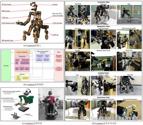 Centauro[11]是德國伯恩大學(xué)計(jì)算機(jī)學(xué)院研制的遙操作輪腿復(fù)合的移動(dòng)操作機(jī)器人(如圖5(a)(b))。Centauro整體采用與半人馬相似的構(gòu)型,頭部配備一個(gè)3維激光雷達(dá),實(shí)現(xiàn)對(duì)環(huán)境的三維建zhon圖和感知;頭部下端四周配置3個(gè)廣角相機(jī)用于實(shí)時(shí)監(jiān)控各部分的運(yùn)動(dòng)狀態(tài);頸部配備一臺(tái)kinect相機(jī)用于對(duì)抓取目標(biāo)物體的識(shí)別和姿態(tài)估計(jì);肩部配備兩個(gè)七自由度的機(jī)械臂和9自由度的機(jī)械手,可以完全模仿人體手臂的全部運(yùn)動(dòng),機(jī)械手腕部配備扭力傳感器和手部配備壓力傳感器,用于操作端的力反饋;行走機(jī)構(gòu)由四個(gè)5自由的機(jī)械腿構(gòu)成,可完成人體腿部運(yùn)動(dòng)的模仿,每個(gè)腿部具有獨(dú)立驅(qū)動(dòng)的主動(dòng)輪,可實(shí)現(xiàn)平整路面快速移動(dòng)和復(fù)雜路面的步態(tài)運(yùn)動(dòng),腿部運(yùn)動(dòng)由基座的兩個(gè)RGB相機(jī)實(shí)時(shí)監(jiān)控;控制單元由三個(gè)PC構(gòu)成,分別負(fù)責(zé)基礎(chǔ)系統(tǒng)控制,視覺感知處理和G級(jí)功能控制(多傳感器數(shù)據(jù)融合)。操作者可通過遠(yuǎn)程操作平臺(tái)(如圖5(c))實(shí)時(shí)操作Cantauro完成各種復(fù)雜操作任務(wù),通過簡(jiǎn)單設(shè)置,Centauro通過融合自身攜帶的多傳感器信息可實(shí)現(xiàn)自主移動(dòng)和抓取操作。Tobias Klamt[12]測(cè)試了Centauro在多種操作任務(wù)中的系統(tǒng)穩(wěn)定性(如圖5(d))。