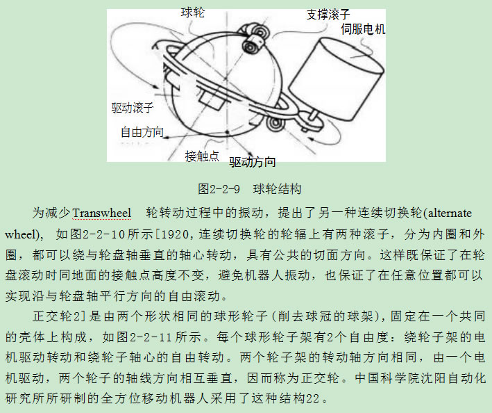 球 輪(ball wheel)由一個(gè)滾動(dòng)球體、 一組支撐滾子和一組驅(qū)動(dòng)滾子組成,其中 支撐滾子固定在車底盤上,驅(qū)動(dòng)滾子固定在一個(gè)可以繞球體中心轉(zhuǎn)動(dòng)的支架上,如 圖2-2-9所示15.16]。每個(gè)球輪上的驅(qū)動(dòng)滾子由一個(gè)電機(jī)驅(qū)動(dòng),使球輪繞驅(qū)動(dòng)滾子 所構(gòu)成平面的法線轉(zhuǎn)動(dòng),同時(shí)可以繞垂直的軸線自由轉(zhuǎn)動(dòng)。輪子的驅(qū)動(dòng)力是滾子 和輪子的摩擦力,使得輪子的驅(qū)動(dòng)力和速度受到限制,這也是球輪的缺點(diǎn)。同時(shí), 輪子在地面滾動(dòng)過程中吸附的一些灰塵,會(huì)在輪子和滾子的接觸點(diǎn)積累,影響兩者 之間的摩擦力,使輪子打滑,我們?cè)谑褂脻L動(dòng)鼠標(biāo)時(shí)都會(huì)有同樣的感受。因而,對(duì) 球輪的改進(jìn)方法是有效增加滾子和球體之間的摩擦驅(qū)動(dòng)力。
