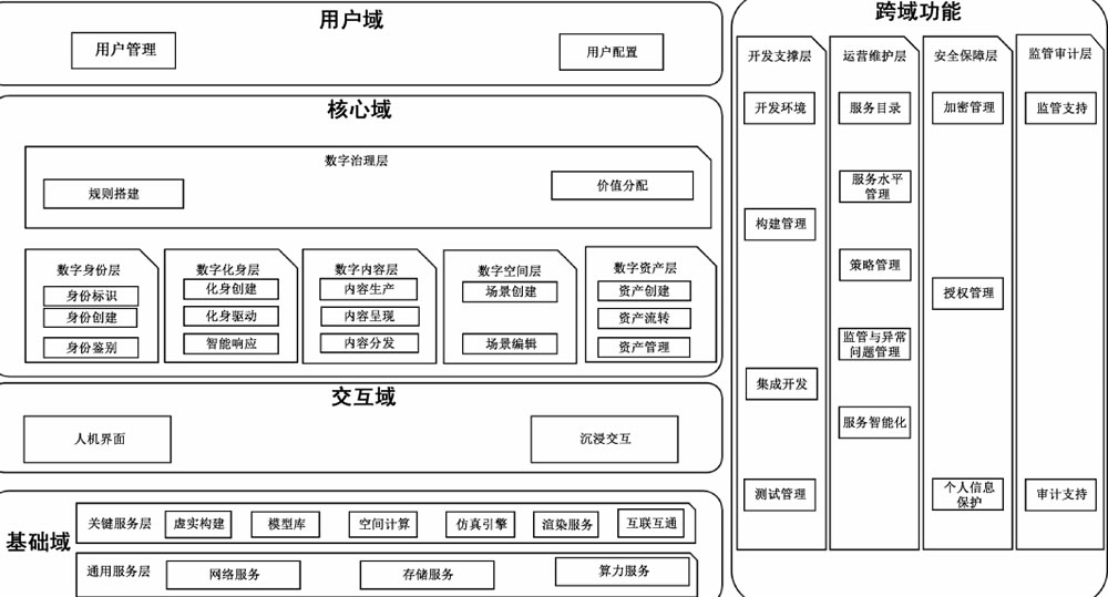 元宇宙系統(tǒng)架構可劃分為四個功能域和跨域功能(見圖1),包括:
