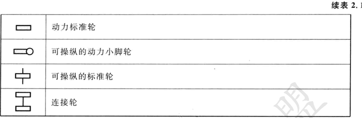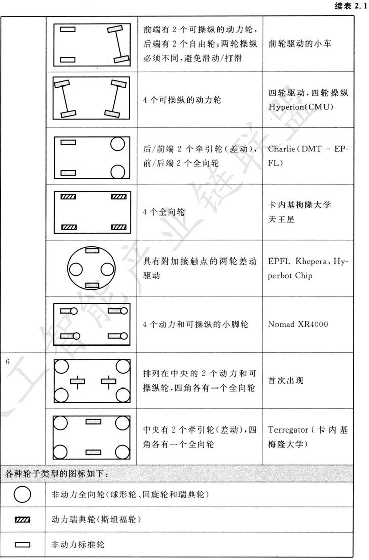 表2.1給出了輪子結(jié)構(gòu)的概貌,按輪子數(shù)目排序。表中描述了特殊輪子類型的選擇和機器人底盤上它們的幾何結(jié)構(gòu)這兩個方面。我們注意到,所示的某些輪子結(jié)構(gòu)在移動機器人的應(yīng)用中很少用到。例如,兩輪自行車裝配,其機動性中等,可控性 差。再像單腿跳躍機,它根本不能靜止地站著。不過,表中提供了在運動機器人設(shè)計 中可能用到的許多種類輪子結(jié)構(gòu)的說明。