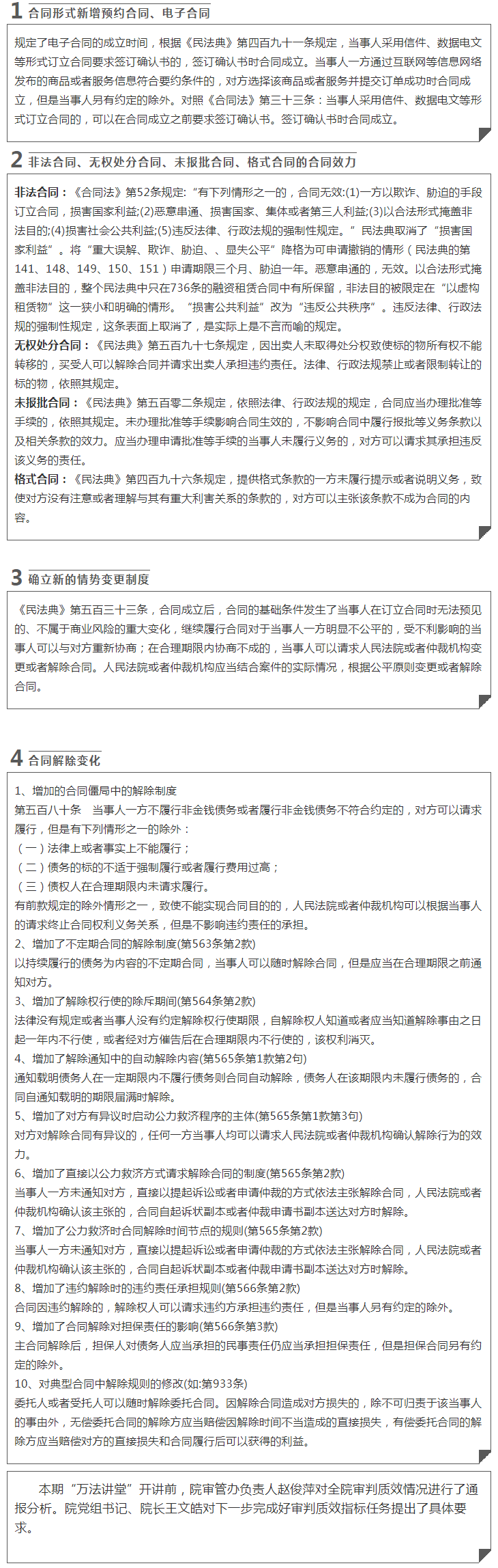 法官助理李洋通過對(duì)比民法典《合同編》與現(xiàn)行《中華人民共和國合同法》等新舊法律條文,解讀了《民法典》編纂中對(duì)原《合同法》訂立規(guī)則相關(guān)法條的完善和創(chuàng)新之處,并歸納總結(jié)出九大重大變化,為參會(huì)人員理解民法典合同編內(nèi)容提供了理論支撐和觀點(diǎn)參考。