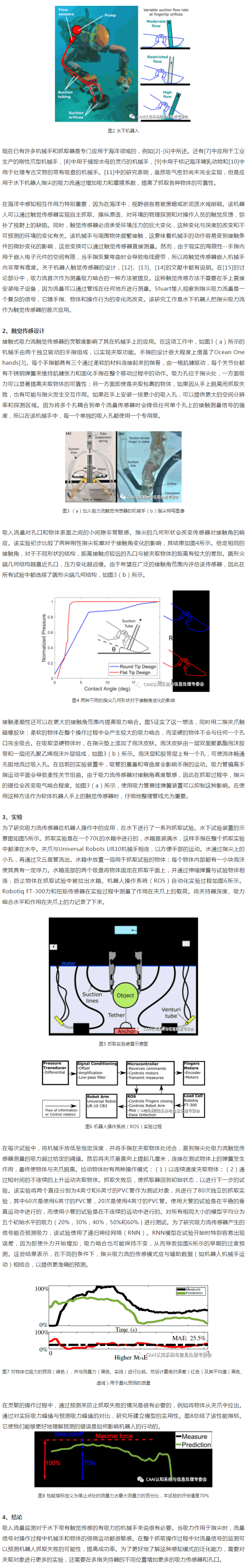 在海洋探索中,水下機器人能在深;虮逻M行海洋資源調(diào)查、估價、勘探、海底地形地貌攝影與繪圖、海底采樣、水文調(diào)查、海底石油管道與電纜的檢測與維修、海洋石油平臺和海洋工作站的檢測維護等[1]。而在水下進行抓取和移動的雙手可以使水下機器人平臺更好地應(yīng)對具有挑戰(zhàn)性的場景。面向水下機器人的靈巧操作,加州伯克利大學(xué)在ICRA2020發(fā)表了一篇“Tactile sensing based on fingertip suction flow for submergeddexterous manipulation”的論文。作者引入了一種新型的觸覺傳感方法,在柔順的手的指尖處使用溫和的吸力流,如圖2所示,可以方便地應(yīng)用到水下機器人。該方案的一個大好處是泵和傳感器可以安裝在靠近手臂的機器人底座上進行保護,并實現(xiàn)與機械手遠(yuǎn)程連接。