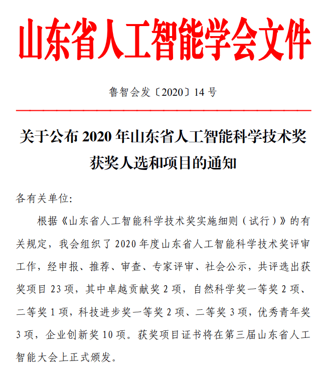 根據(jù)《山東省人工智能科學(xué)技術(shù)獎實施細則(試行)》的有關(guān)規(guī)定,我會組織了2020年度山東省人工智能科學(xué)技術(shù)獎評審工作,經(jīng)申報、推薦、審查、專家評審、社會公示,共評選出獲獎項目23項,其中出色貢獻獎2項,自然科學(xué)獎一等獎2項、二等獎1項,科技進步獎一等獎2項、二等獎3項,優(yōu)秀青年獎3項,企業(yè)創(chuàng)新獎10項。獲獎項目證書將在第三屆山東省人工智能大會上正式頒發(fā)。