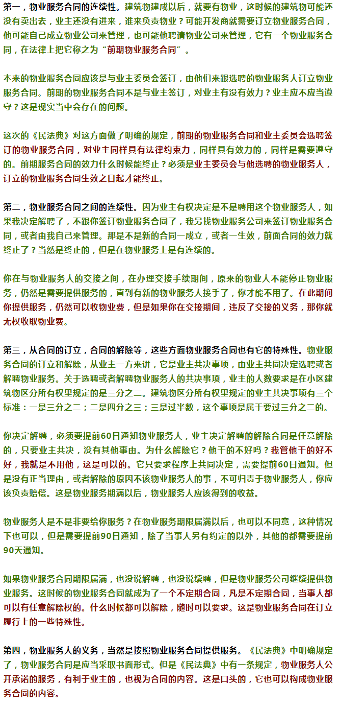 物業(yè)服務(wù)是隨著我們城市化的發(fā)展,居民小區(qū)的公共服務(wù)需要而產(chǎn)生的。物業(yè)服務(wù)合同它是在委托合同這一章后,它從合同標(biāo)的上來(lái)講,跟委托合同的標(biāo)的是類(lèi)似的,都屬于提供勞務(wù)類(lèi)的。《民法典(草案)》當(dāng)中曾經(jīng)規(guī)定,物業(yè)合同沒(méi)有規(guī)定的,參照適用委托合同的規(guī)定。曾經(jīng)有這條規(guī)定,但是后來(lái)沒(méi)有了,它還是有很大的差別,但是從提供勞務(wù)服務(wù)的標(biāo)的上來(lái)講,它們是屬于同一類(lèi)服務(wù)合同。