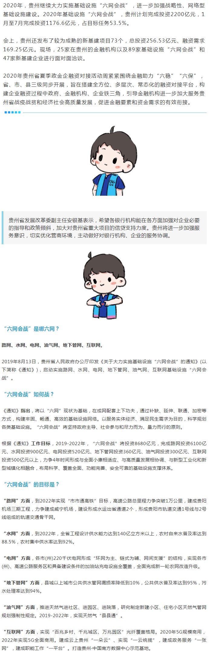 8月6日,2020年貴州省夏季政金企融資對(duì)接活動(dòng)周基礎(chǔ)設(shè)施“六網(wǎng)會(huì)戰(zhàn)”和新基建項(xiàng)目融資洽談會(huì)在貴陽舉行。會(huì)上,省發(fā)展改革委向金融機(jī)構(gòu)發(fā)布了“六網(wǎng)會(huì)戰(zhàn)”和新基建項(xiàng)目261個(gè),總投資5477.98億元、融資需求3290.53億元。其中,新基建項(xiàng)目73個(gè),總投資256.53億元、融資需求169.25億元。25家在黔金融機(jī)構(gòu)與89家基礎(chǔ)設(shè)施“六網(wǎng)會(huì)戰(zhàn)”和47家新基建項(xiàng)目建設(shè)單位進(jìn)行了面對(duì)面洽談。