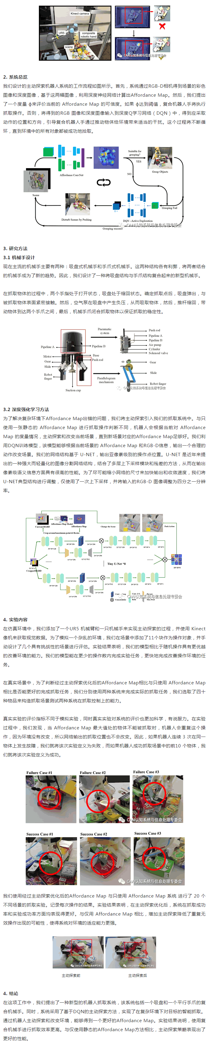 學(xué)術(shù)界和工業(yè)界都在尋求解決方案,許多研究人員針對這一課題開展了工作。Andy Zeng 等人通過對整個(gè)場景的分析,提出了利用Affordance Map(一個(gè)包含每個(gè)抓取點(diǎn)的置信度的圖)來獲取抓取區(qū)域的方法,大大提G了抓取的效率。然而,由于環(huán)境通常是復(fù)雜和無結(jié)構(gòu)化的(例如混亂的場景),有時(shí)機(jī)器人很難找到合適的位置來抓住物體。