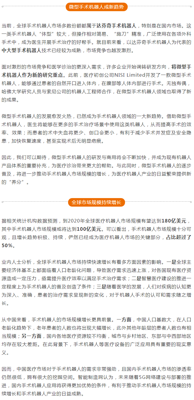 傳統(tǒng)的手術(shù)方式存在著準(zhǔn)確度、耗費時長、視野角度等多方面問題,而手術(shù)機器人的應(yīng)用可以很好地解決上述難點。通過手術(shù)機器人來輔助進行手術(shù),具有準(zhǔn)確度G、出血量少、創(chuàng)傷面小、恢復(fù)速度快等優(yōu)勢,得到了醫(yī)生、患者