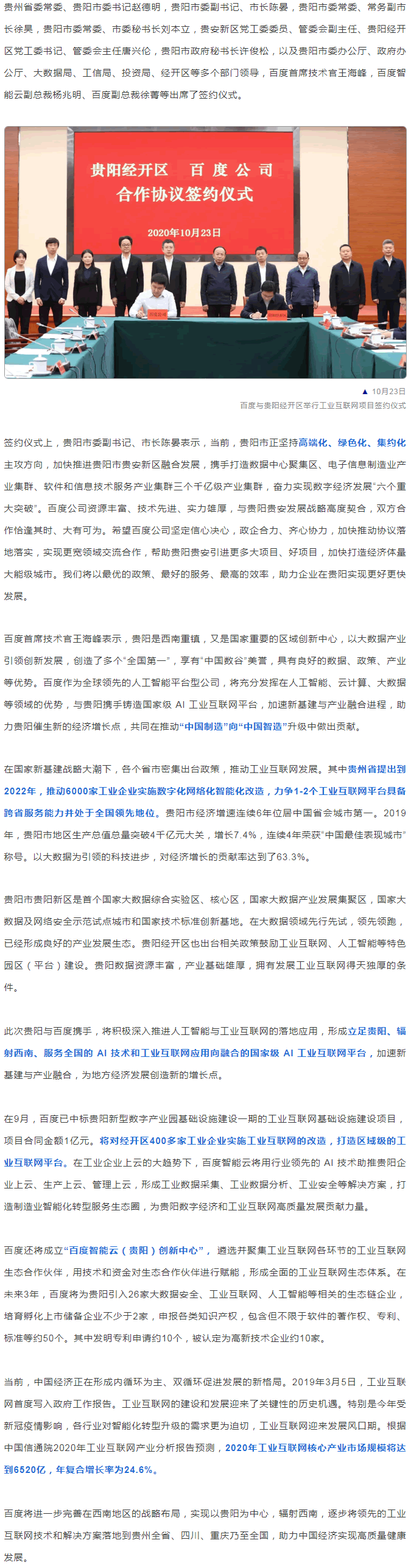 10月23日,百度與貴州省貴陽市政府正式簽署戰(zhàn)略合作協(xié)議,與貴陽經(jīng)開區(qū)舉行工業(yè)互聯(lián)網(wǎng)項(xiàng)目簽約儀式。百度將承接貴陽經(jīng)開區(qū)工業(yè)互聯(lián)網(wǎng)項(xiàng)目建設(shè),打造 AI 技術(shù)和工業(yè)互聯(lián)網(wǎng)應(yīng)用相融合的 AI 工業(yè)互聯(lián)網(wǎng)平臺(tái),形成多面的工業(yè)互聯(lián)網(wǎng)生態(tài)體系,助力貴陽打造3個(gè)千億級產(chǎn)業(yè)集群,形成新的經(jīng)濟(jì)增長點(diǎn)。