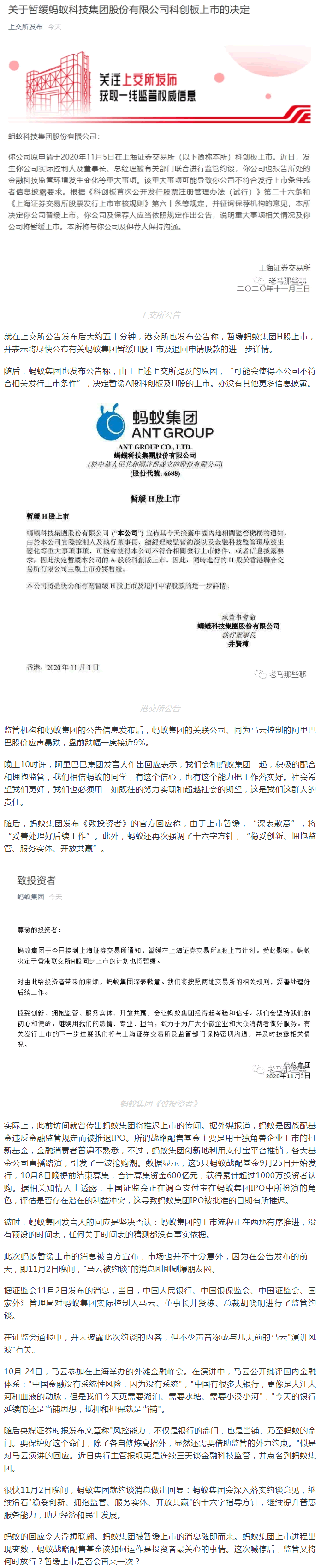 螞蟻集團原定于11月5日(本周四)在科創(chuàng)板上市計劃,果然發(fā)生重大變化!