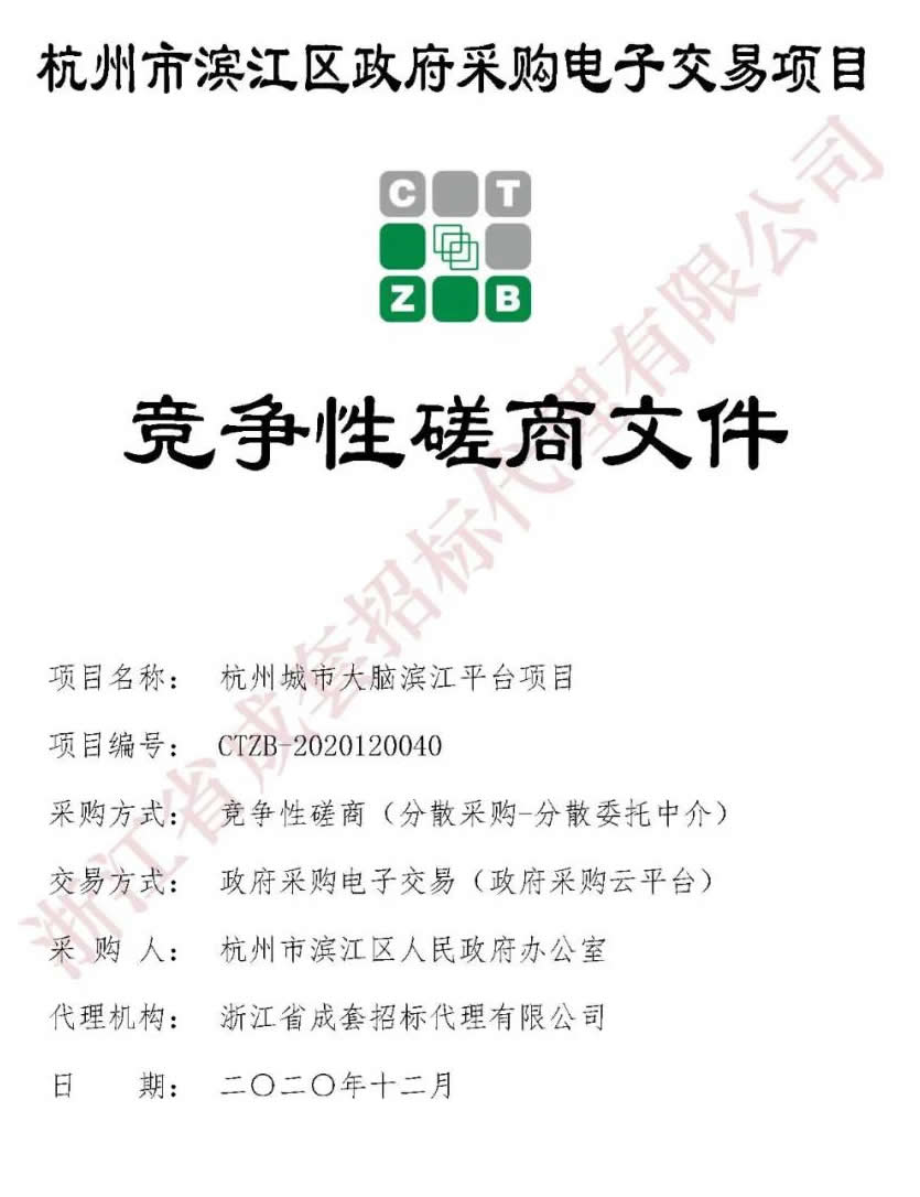 項目編號:CTZB-2020120040,項目采購內(nèi)容為杭州市濱江區(qū)人民政府辦公室所需的杭州城市大腦濱江平臺,主要內(nèi)容包括杭州城市大腦濱江平臺相關(guān)的數(shù)字樞紐基礎(chǔ)能力平臺軟硬件租賃服務(wù)、運(yùn)維服務(wù)