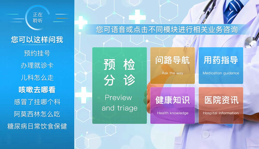 醫(yī)院智能機(jī)器人正在人民醫(yī)院為患者提供導(dǎo)診用藥問詢與藥品禁忌查詢配伍查詢價格查詢等便民服務(wù)功能說明