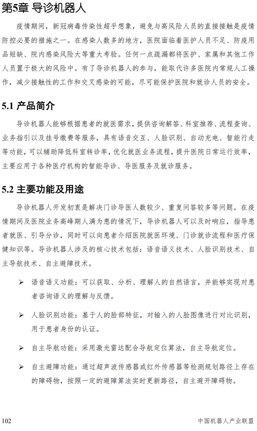 隨著自然語言處理、計算機(jī)視覺、多傳感器融合、大數(shù)據(jù)、AI 等技術(shù)的不斷發(fā)展,導(dǎo)診機(jī)器人的功能將會日趨完善,進(jìn)一步協(xié)助各大醫(yī)院優(yōu)化資源配比,提升醫(yī)療效率,真正滿足改善患者的就醫(yī)體驗的核心需求。例如:借助云平臺與?漆t(yī)療知識圖譜技術(shù),機(jī)器人可與患者進(jìn)行更加人性化、專業(yè)化的導(dǎo)診溝通,更準(zhǔn)確地定位患者所問詢的病情;建立患者病例病史數(shù)據(jù)庫,為患者提供更加準(zhǔn)確快速的分診服務(wù),減少病人等待時間,優(yōu)化醫(yī)院診療體驗;提升移動導(dǎo)航性能, 快速且實時更新動態(tài)場景地圖信息,做到零碰撞,無差錯地科室導(dǎo)引;連接醫(yī)療物聯(lián)網(wǎng)資源,實現(xiàn)跨區(qū)域?qū)г\信息共享,促進(jìn)分級診療制度的推廣;具備典型病癥數(shù)據(jù)庫,通過檢測患者的體貌癥狀,判斷患者病癥傳染性;提G語音交互的抗環(huán)境干擾能力和準(zhǔn)確性,可以更好的在醫(yī)院等環(huán)境嘈雜的應(yīng)用場景下,為患者提供準(zhǔn)確的導(dǎo)醫(yī)服務(wù)。