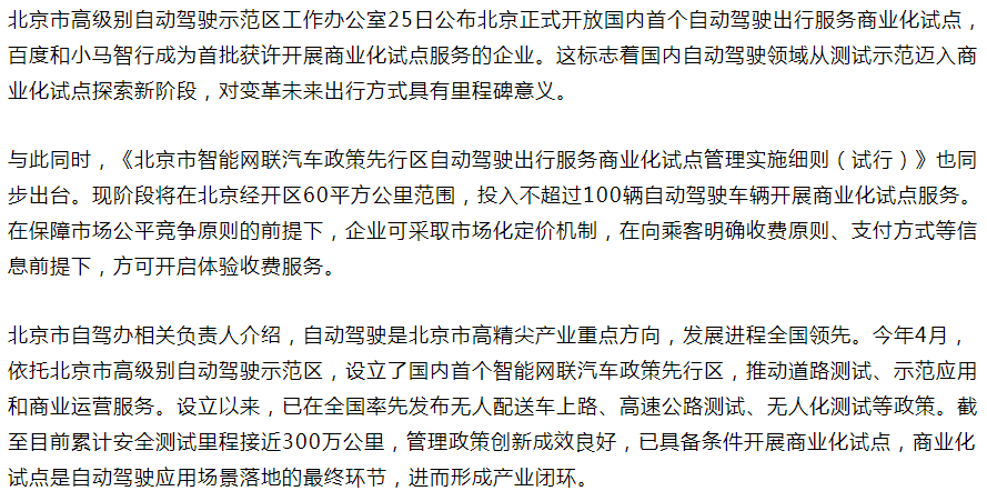 北京市智能網(wǎng)聯(lián)汽車政策先行區(qū)自動(dòng)駕駛出行服務(wù)商業(yè)化試點(diǎn)管理實(shí)施細(xì)則