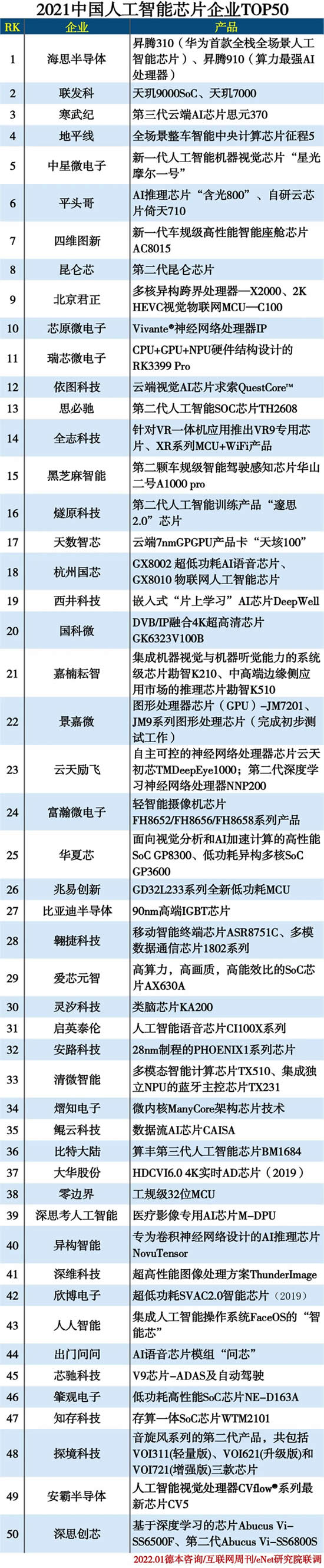 > 2021中國(guó)人工智能芯片企業(yè)TOP50