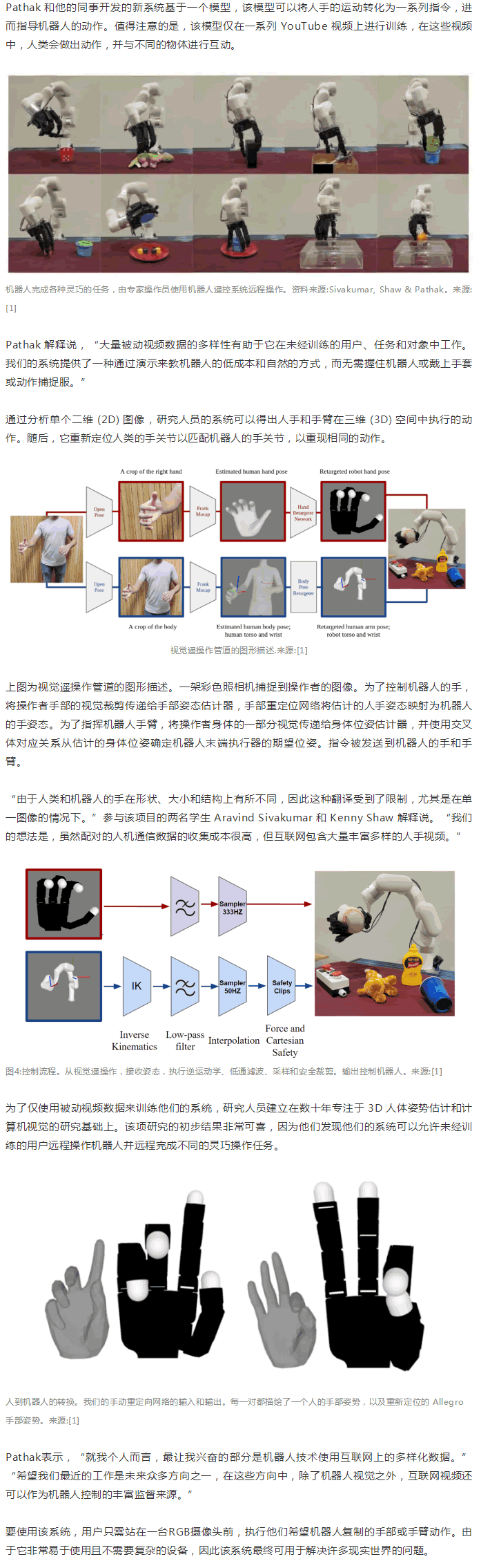 研究人員Deepak Pathak 告訴 TechXplore,“這一L域之前的工作要么依賴手套、運(yùn)動(dòng)標(biāo)記器,要么依賴校準(zhǔn)的多攝像機(jī)設(shè)置。而我們的系統(tǒng)使用一個(gè)未校準(zhǔn)的攝像機(jī)。由于不需要校準(zhǔn),用戶可以站在任何地方,仍然可以成功地遠(yuǎn)程操作機(jī)器人!