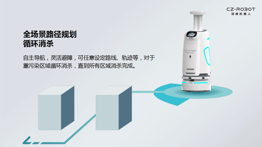 消毒機器人在疫情現(xiàn)場,重點針對患者、醫(yī)護、醫(yī)廢的G頻活動區(qū)域進行沿路經(jīng)自動G水平消毒,重點針對患者和醫(yī)護人員的所處區(qū)域進行多點終末消毒。