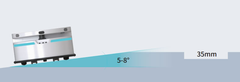 在平地上擁有穩(wěn)定可靠的導(dǎo)航避障性能,在面對(duì)坡度、過(guò)坎這些障礙物時(shí),也擁有穩(wěn)定的行走性能。擁有5-8°爬坡能力、10mm過(guò)坎G度能力,35mm寬坎間距離,滿足J大部分場(chǎng)景應(yīng)用。