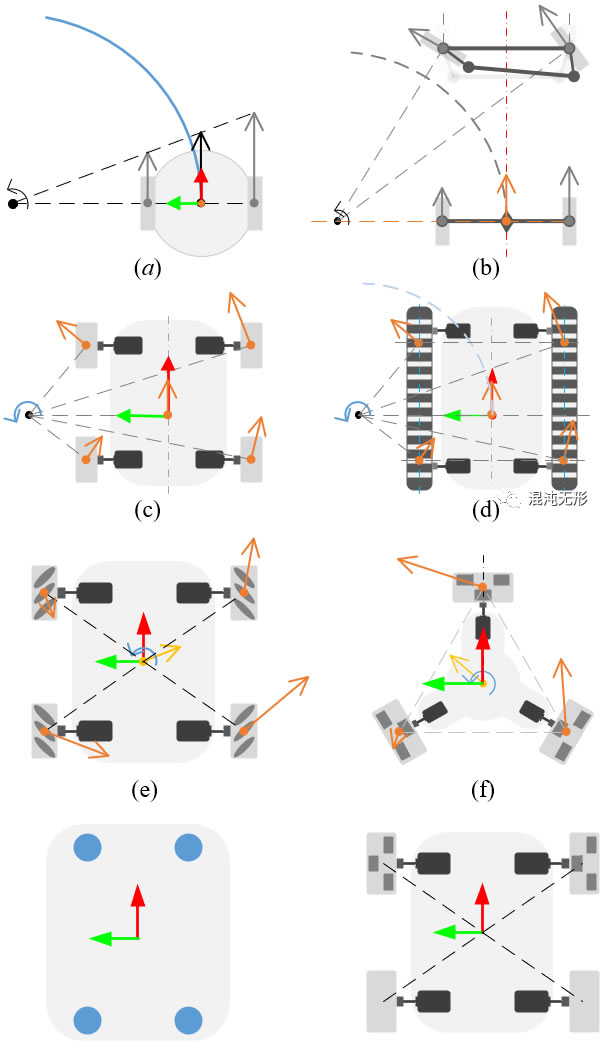圖 2.3(g)中的四個(gè)藍(lán)色原點(diǎn)表示舵輪的位置,上述談到每個(gè)舵輪有兩個(gè)電機(jī),分別控制輪子滾動(dòng)和轉(zhuǎn)向,因此這種類型的機(jī)器人也被稱為四驅(qū)四轉(zhuǎn)移動(dòng)機(jī)器人。