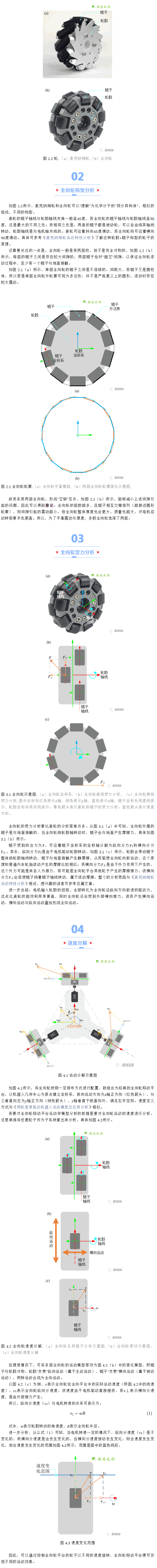 本文先描述了全向輪的構(gòu)型及基本特點(diǎn),接著對(duì)單個(gè)全向輪進(jìn)行了受力分析,指出了電機(jī)轉(zhuǎn)矩與全向輪所受分力的關(guān)系,并在此基礎(chǔ)上分析了全向輪縱向分速度與電機(jī)輸出轉(zhuǎn)速之間的關(guān)系,給出速度分解方程;后,總結(jié)分析了全向輪的在實(shí)際使用過程中的特點(diǎn)及問題。
