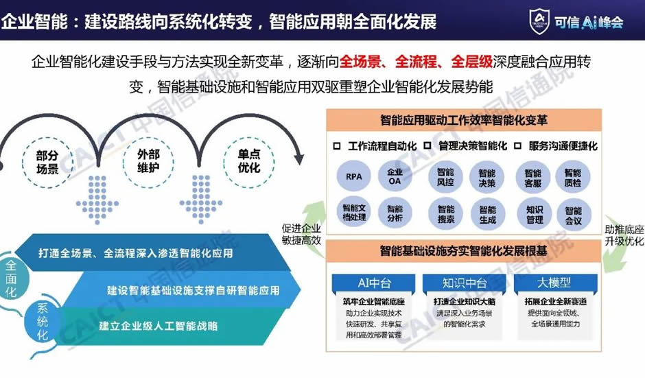 企業(yè)智能化建設手段與方法實現全新變革,逐漸向全場景、全流程、全層級深度融合應用轉變。隨著智能化技術的不斷發(fā)展和應用深入,企業(yè)智能建設從部分場景、外部維護、單點優(yōu)化逐漸向系統化、多面化轉變,通過智能基礎設施和智能應用雙驅重塑企業(yè)智能化發(fā)展勢能。