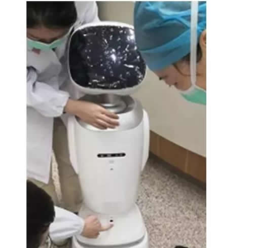 輪式移動(dòng)機(jī)器人,可在無(wú)接觸情況下查看病人電子病歷,調(diào)取檢查報(bào)告;同時(shí)具有安撫病患情緒、心理疏導(dǎo)等功能。