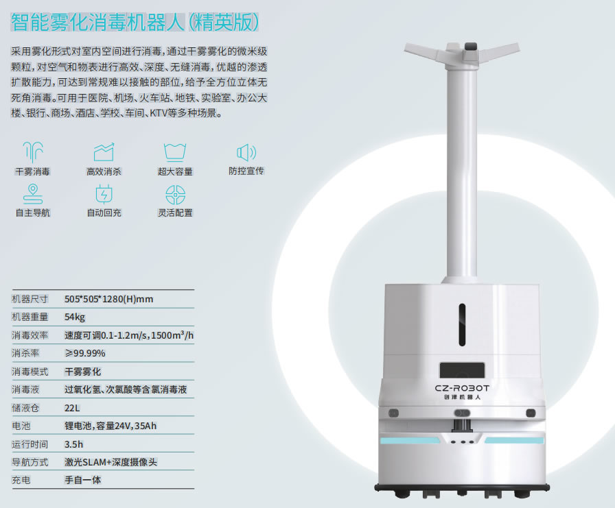 創(chuàng)澤精英版霧化消毒機(jī)器人以輪式機(jī)器人底盤為載體,采用霧化形式對室內(nèi)空間進(jìn)行消毒,通過干霧霧化的微米級(jí) 顆粒,對空氣和物表進(jìn)行G效、深度、無縫消毒,優(yōu)越的滲透 擴(kuò)散能力,可達(dá)到常規(guī)難以接觸的部位,給予全方位立體無 死角消毒?捎糜卺t(yī)院、機(jī)場、火車站、地鐵、實(shí)驗(yàn)室、辦公大樓、銀行、商場、酒店、學(xué)校、車間、KTV等多種場景
