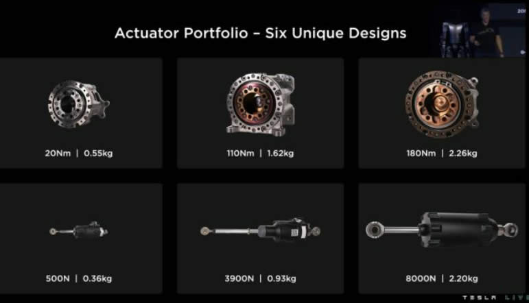 電機(jī)驅(qū)動(dòng)上,“擎天柱”擁有 2.3KWH、52V 電壓的電池組,內(nèi)置電子電器元件的一體 單位,支持人形機(jī)器人工作一整天;選用 28 個(gè)定制關(guān)節(jié)驅(qū)動(dòng)器,復(fù)用汽車動(dòng)力總成設(shè)計(jì)經(jīng) 驗(yàn),設(shè)計(jì) 6 種關(guān)節(jié)驅(qū)動(dòng)器,包括 3 種不同規(guī)格的舵機(jī)(采用諧波減速器)和 3 種不同規(guī)格 的直線執(zhí)行器(采用永磁電機(jī),可抬動(dòng) 1.5 噸三角鋼琴的),找到成本與效率的佳組合。