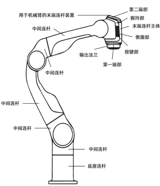 以思靈機(jī)器人機(jī)械臂產(chǎn)品為例,這是一種用于機(jī)械臂的末端連桿裝置,包括末端連桿主體,末端連桿主體設(shè)置在機(jī)械臂的輸出端;至少一個(gè)握持部,握持部能夠被握持, 至少一個(gè)握持部形成在末端連桿主體上,且與末端連桿主體一體地形成;以及按鍵部, 按鍵部形成在握持部上,按鍵部能夠被操作,其中,握持部相對(duì)于末端連桿主體的與握 持部鄰接的表面凹陷