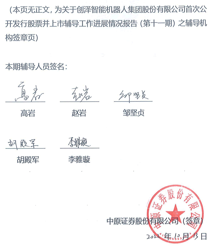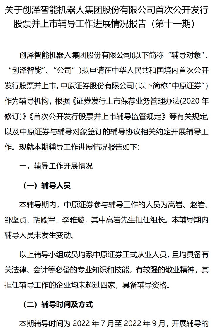 創(chuàng)澤智能機器人集團股份有限公司首次公開發(fā)行股票并上市輔導工作進展報告(第十一期)