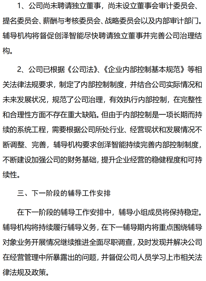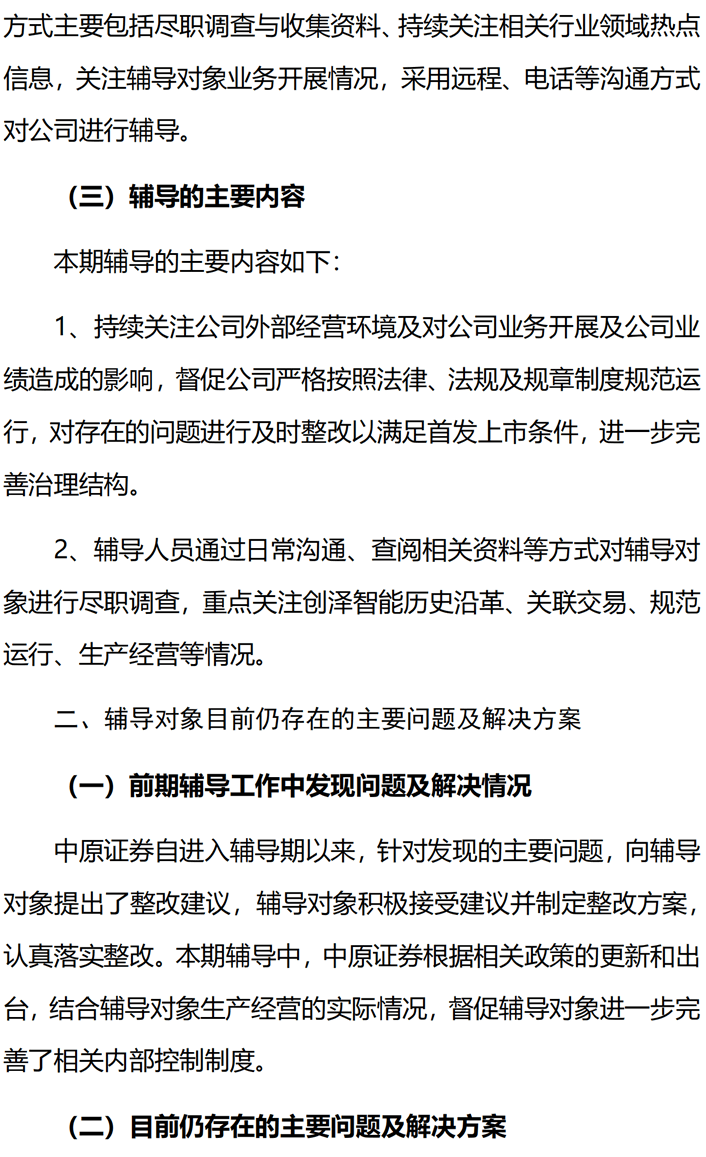 中原證券關于創(chuàng)澤機器人上市輔導內容,對公司業(yè)務開展及公司業(yè)績造成的影響,督促公司嚴格按照法律,法規(guī)及規(guī)章制度規(guī)范運行,關注創(chuàng)澤智能歷史沿革生產(chǎn)經(jīng)營等情況