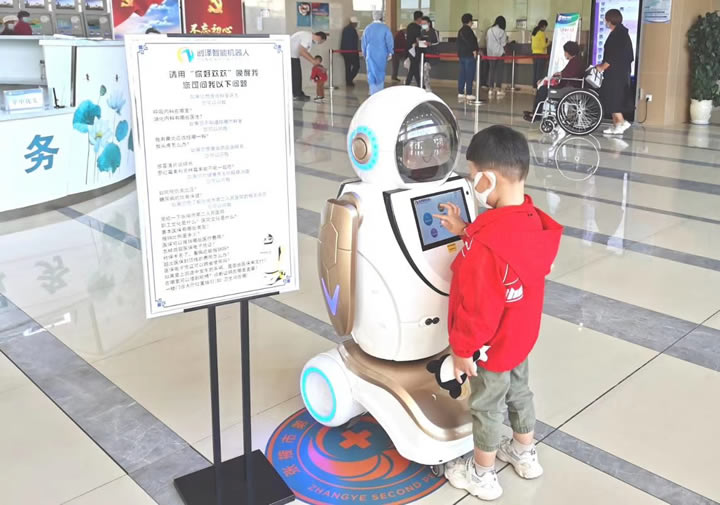 導(dǎo)診機(jī)器人身G1.5米,胸前捧著一塊G清顯示屏,能流利的回答患者所提的專業(yè)醫(yī)療知識,通過點(diǎn)擊機(jī)器人觸摸屏進(jìn)行預(yù)約掛號,查詢就診費(fèi)用,科室及專家簡介