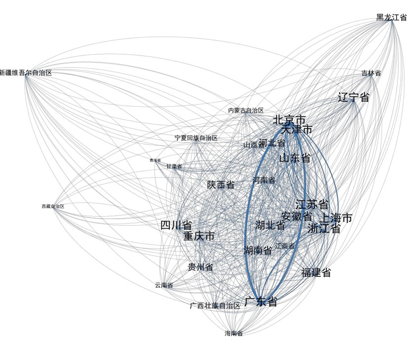 基于 2200 家我國(guó)人工智能骨干企業(yè)的技術(shù)合作關(guān)系,報(bào)告構(gòu)建了價(jià)值網(wǎng) 絡(luò)空間分布圖(如圖 16 )。從技術(shù)合作關(guān)系的密度看,北京市、廣東省和上海 市構(gòu)成了人工智能產(chǎn)業(yè)集群網(wǎng)絡(luò)結(jié)構(gòu)的三個(gè)“J點(diǎn)”。同時(shí),北京市、廣東省、 上海市、江蘇省、安微市、四川省、湖北省、湖南省、重慶市、山東省和福建 省之間存在密集的人工智能技術(shù)合作關(guān)系